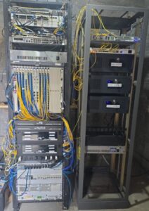 Gabinetes 4u em rack 19, energia trifásica operando a 220v, 60 painéis solar 250w, vários nobreaks 1400VA senoidal com bateria 72AH, cada um com 1000VA de carga, suficiente para manter 2 a 3 servidores por 2 horas sem eletricidade, temos 2 links de empresas diferentes redundantes, nossa rede é feita por WRT, MIKROTIK e HUAWEI.